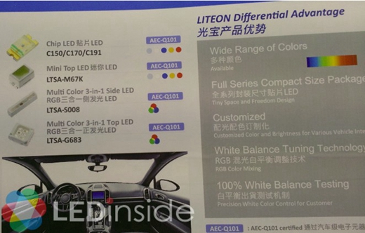 有别于白光仅对于散热与亮度的效能追求,光宝在车内光源部分,推出了三合一的混色芯片,能够搭配不同车种对于不同色温的客制化需求,对于人因照明在车内应用的趋势来看,能够带给车内乘坐者更多的乘坐氛围。