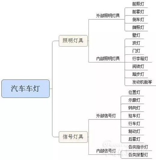汽车照明系统主要由汽车车灯来支撑,汽车车灯按用途可分为照明灯具和信号灯具,按安装位置可分为内部灯具和外部灯具。