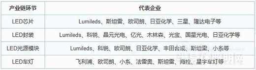 在国内,车用LED营收排名前几大厂商为欧司朗、DOMINANT Opto、Lumileds、首尔半导体、日亚化学、三星、亿光。