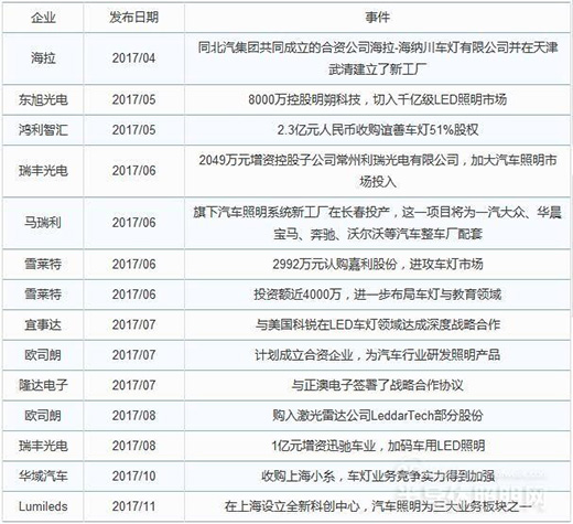 2017年上半年行业内有较多大动作,LED企业纷纷通过设立新厂、收购、增资、企业战略合作等方式加速争夺车用LED照明市场份额。下表为截至目前行业内一些大事件: