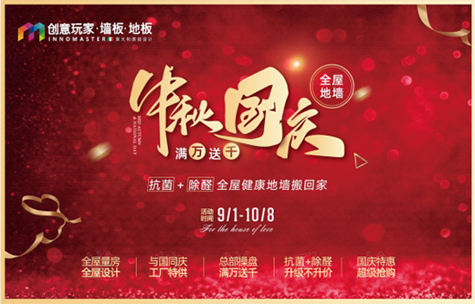金秋九月,国庆将至。创意玩家时刻心系消费者,竭力为客户打造品质卓越的多元风格产品,力求给予客户最实惠的价格与最诚挚的服务。为回馈广大消费者一直以来的百般信赖与支持,2020年9月1日至10月8日,创意玩家以“中秋国庆·满万送千”为主题的全屋地墙优惠活动现正火热开启!本次优惠活动,创意玩家又将给予消费者怎样的优惠福利?以下将围绕“送”、“特”与“惠”三个关键字揭晓答案。