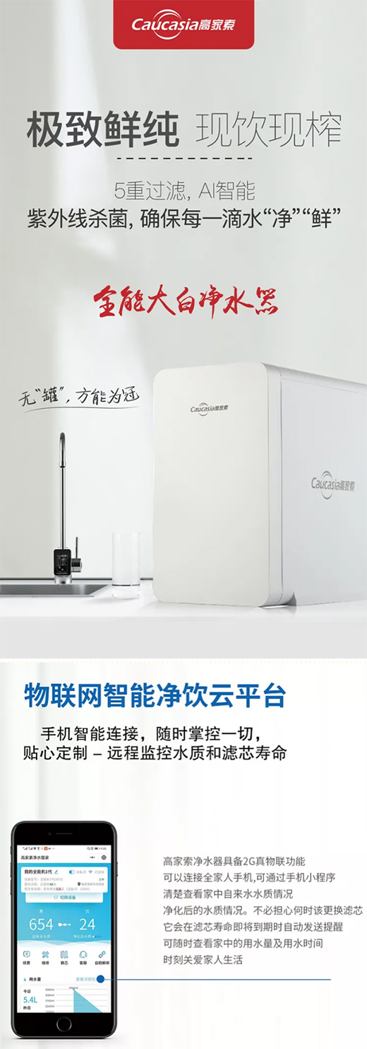 高家索智能净饮系列,采用RO反渗透技术,可有效滤除水中泥沙、悬浮物等有害物质,为家人饮水健康竖起最后一道防线!完全不用费心费力,家中的水质就能始终给力。滤芯更换即时提醒,智能物联安全守护,守护您用水健康!