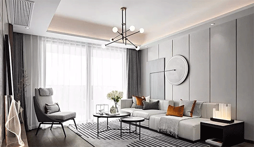 沙发墙上的装饰画组合,方形+圆形的组合设计,通过线条贯穿让画面统一起来,结合优雅的吊灯,灰色的窗帘搭配,也是显得更加简约而又艺术感。