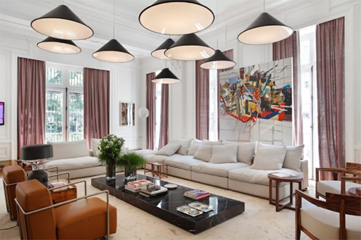 这些窗帘像是飞流而下的瀑布,令人感到惊奇。地毯造型形似一汪碧绿池水,倒映着曼妙多姿的睡莲。窗帘和地毯以及其他纺织品联合现代家具与艺术陈设,共同构建了这个美轮美奂的室内场景。