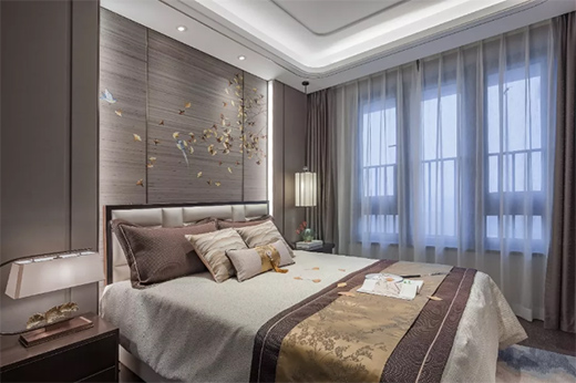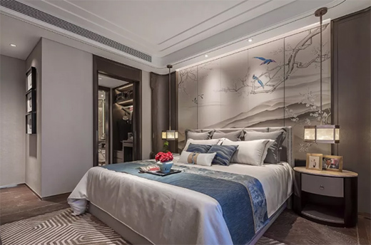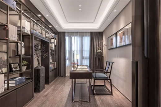 设计是人和人、人和物以及人和空间凝聚的重要媒介。一幅水墨画,抑或是一个白瓷瓶,都能成为主人个性的延展。设计师采用高级灰咖色系为主色调,绯红、深蓝为点缀色,拉丝铜、皮革、花鸟、艺术摆件等在内的元素,让空间营造出高雅宁静的人文意境。主卧连通衣帽间与独立卫浴,龟裂的石材纹理搭暖色的中式吊灯,为主人营造私密惬意的沐浴氛围。