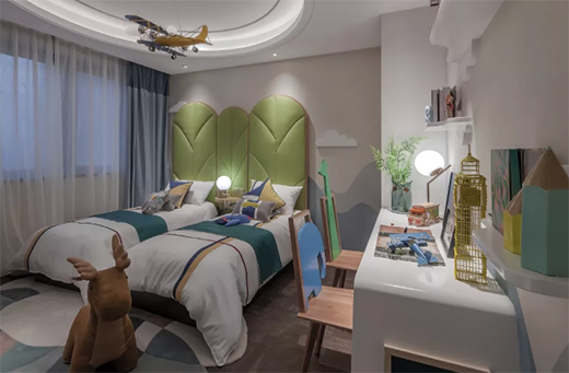 儿童房则以清新的绿色森林系主题从整个空间氛围中跳脱出来,随处可见的动物元素和山峰、云朵、飞机造型,为孩子构建了一个童真童趣的空间。设计师精心设计了一体式的衣柜书桌,合理规划了生活和学习的区域。