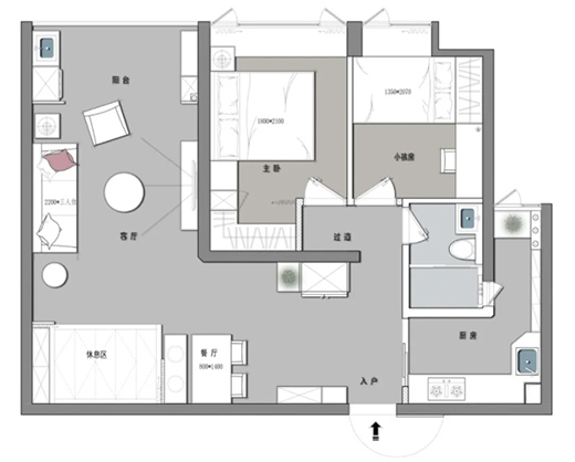 主卧新增衣帽间的设计,增加了过道空间,改变卧室门的朝向,避免了门对门的问题。