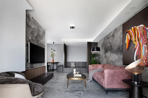 为了与地面相呼应,经过了种种选材,又尝试了不同的粉刷方式,最终选择使用艺术涂料打造这面大气且具有高级感的背景墙,呈现出了让主人公和设计师都满意的效果。