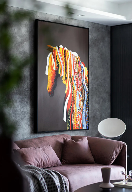 以梦为马,不负韶华。以个性的背景墙打底,挂上男主人公挑选的《骏马》装饰画,大胆配色作为整面墙的“高光”,渲染出活跃气氛的同时也使整体视觉有了焦点。