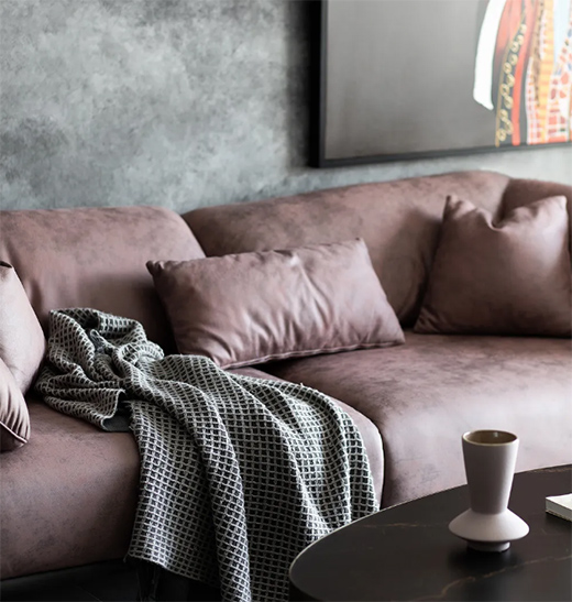 为搭配皮粉色的沙发,设计师特地找来了一个同色系的花瓶作为整体配色的前后呼应。