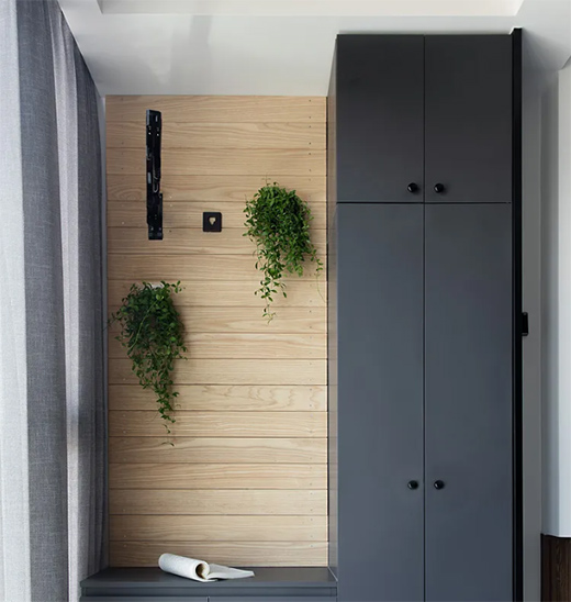 阳台一角设立的收纳空间,利用冷峻的灰邂逅温暖原木,擦出了不一样的火花。