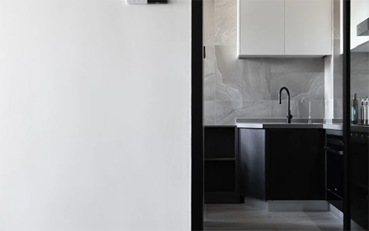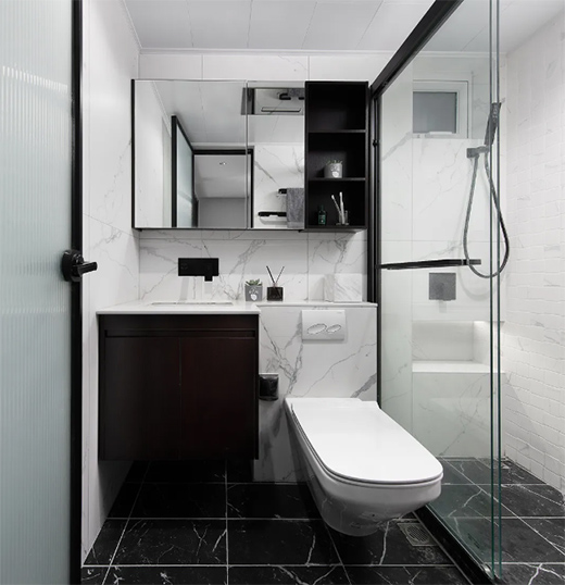 卫生间由于采光不佳,我们采用了黑白对比的方式,让空间看起来更加干净明亮。增加推拉式玻璃门做了干湿分区,洗手池上方的镜子与储物柜合二为一。