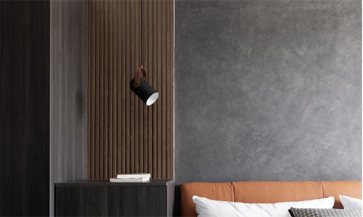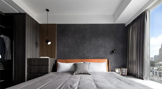 沉稳的深灰色背景墙由肌理漆打造,兼具厚重肌理与高级质感,保持与房间内家具的色调一致,延续着主人的喜好和风格,透露出主人时尚精英的气质。