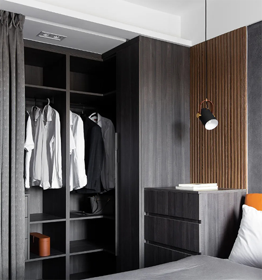 以主人喜欢的黑、白、灰为主,搭配暖橘色作为整体亮点。左靠衣帽间,右靠大飘窗;一面沉静,一面明亮;