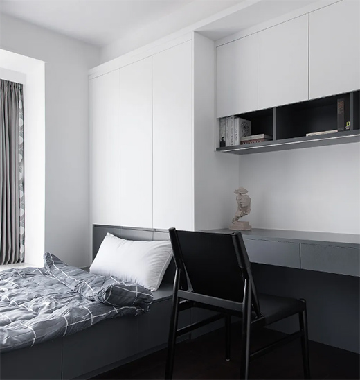 次卧以儿童房兼书房为一体,采用了利用率高的榻榻米设计,合理利用空间,与衣柜、书桌连在一起。