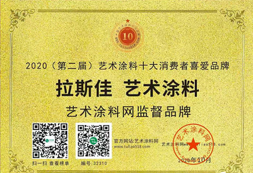 拉斯佳艺术涂料不负所望,从众多参评企业中,脱颖而出。荣获“2020艺术涂料十大消费者喜爱品牌”,在一众行业大咖的共同见证之下,登上领奖舞台,以实力见证品牌崛起,展现品牌的榜样作用。