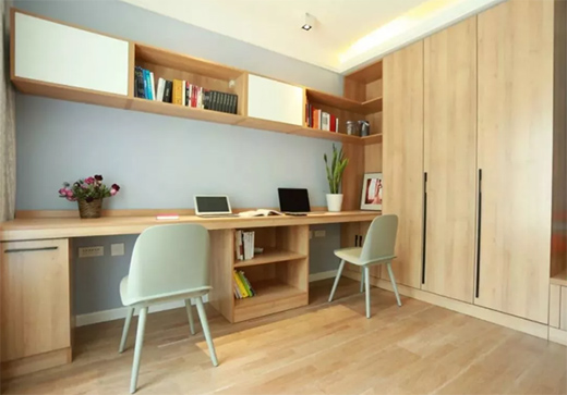 适合相对进深较大的狭长小书房沿着书房从里往外布置书桌,而书桌背后则可以装一排的书架或收纳柜,小小的空间也能为主人提供一个舒适轻松的独立办公空间。