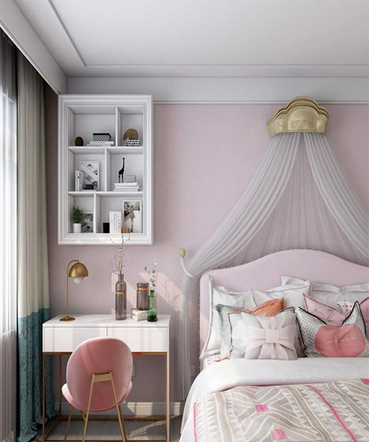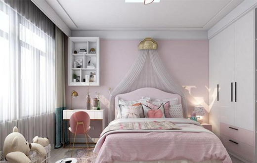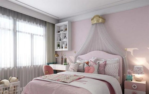 【女儿房】【室内装修】【儿童房背景墙】【儿童房床头背景墙】【儿童房装修配色】对于女孩房间空间,少不了甜美之色的千禧粉。俏皮的颜色一改大白墙的单调和了无生气,连空气中也因这一丝鲜活变得雀跃不已。除了粉色调的搭配,米白色的衣柜、书桌为室内装饰提升了设计感。