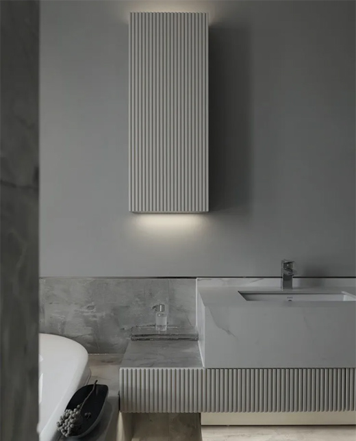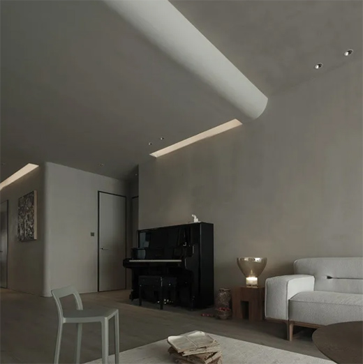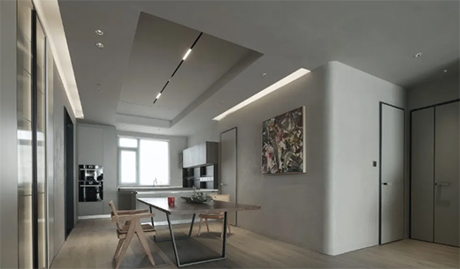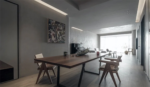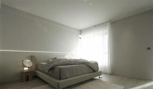 整案墙面和顶面色彩统一,公共区域部分采用吉纳思平面玛德莫产品,纯正意大利色浆调和出的高级灰色,如同凝固的音符谱写出宁静质朴的美感。卧室内部采用单色勒文拜产品,哑光柔和的质地,打造空间舒适氛围。
