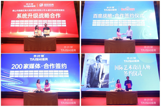 会议在来宾的热烈掌声下进入第二个重要的环节——现场签约。随着众多自媒体的崛起,信息的传播渠道多样化,在这种趋势下,信息的权威性就变得更为重要。泰诗尔顺势而为,强强联合,整合品牌营销资源,举行“千万巨资,品牌推广”的签约仪式。本次会议,泰诗尔与知名品牌营销策划机构盛世经典、500家权威媒体、国外设计大师、百度进行签约仪式,并在媒体朋友们的相机镜头下合影留念。