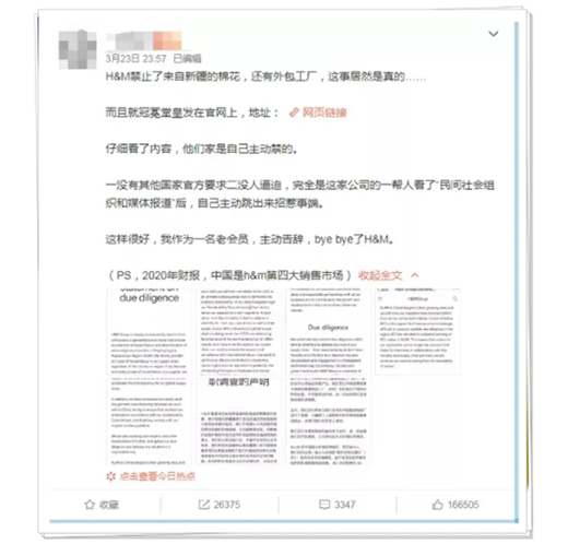 起因源于有博主爆料称H&M公司发声明,主动禁止了来自新疆的棉花和外包工厂,引发中国网友不满。