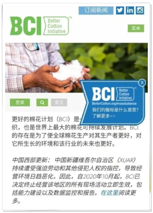 BCI曾于2020年10月21日发表过一份英文声明,该声明宣称“中国新疆维吾尔自治区持续存在的强迫劳动和其他侵犯人权的指控,以及在农场层面上不断增加的强迫劳动风险,导致经营环境难以维持”。