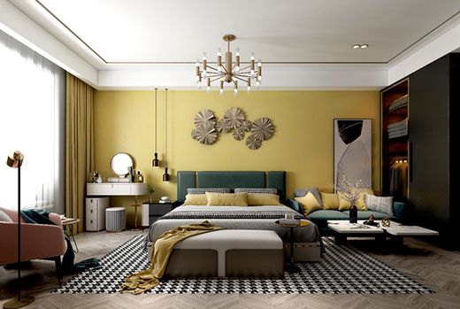 以黄色为主的空间,整体看起来明亮清爽,为空间注入活力。正如卧室装修,布艺窗帘色彩与墙面颜色呼应,淡菊黄墙面,在黄色中注入金属点缀,让空间更灵动,空间浪漫又温暖。