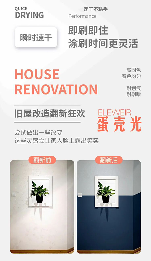 蛋壳光是一种环保艺术涂料,既不抢装饰的风头,自身还带高级感,触感丝滑细腻,具有丝光般的光泽,能够提升空间整体效果展现,其色彩丰富齐全,给大家更多的创造家居色彩灵感。