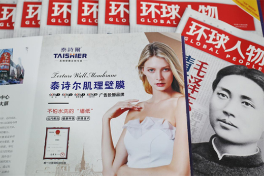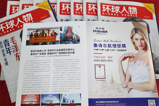 在最新一期《环球人物》上,封面处用较大的版面向众多读者介绍了佛山市顺德区清大润彩涂料有限公司旗下品牌“泰诗尔”不仅是肌理壁膜创始者、肌理壁膜商标专利持有者,更是我国唯一一家出口海外的艺术涂料品牌,在业内拥有广泛的知名度和影响力。其壁膜浆+工艺构成的肌理壁膜装饰效果酷似墙纸,但它与墙纸不同的是更为环保、更加节能、更持久耐用,性价比更具优势,并能克服一般涂料及墙纸普遍存在的各种弊端。它具有绿色环保、耐水防霉、附着力好、经磨耐擦、装饰性强、施工简便等特点,是一种集高新科技与高雅艺术为一体的新型墙面装饰产品,它的问世必定成为墙面装饰艺术的新潮流。