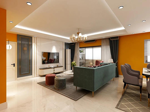 ④三色搭配。空间中的主色彩不超过三种,并且所占比例不得少于20%,三色组合使用得当,往往可使空间效果、家庭氛围醒目、温暖。通常,我们可以采用相邻色系搭配和互补取色搭配方法。例如: