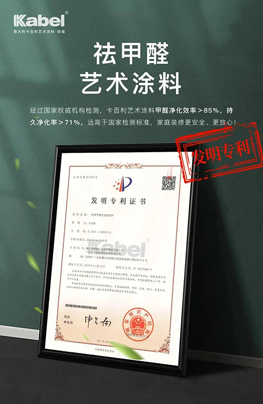 早在2018年,为给消费者呈现一个健康舒适的家居环境,卡百利便加大资金投入,自主研发降解甲醛技术,在乳液聚合阶段把吸醛功能单体化学接枝到乳液大分子上,赋予乳液吸醛功能,并且乳液的这种吸醛功能是通过与甲醛发生化学反应方式进行,反应迅速,降醛效率高,该项降解甲醛技术已在2019年获得国家发明专利。经过国家权威机构检测,卡百利艺术涂料甲醛净化效率>85%,持久净化率>71%,远高于国家检测标准。