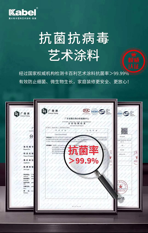 2021年,卡百利又经过长期专项研究,研发出具有抗菌抗病毒功能的涂料——卡百利抗菌抗病毒净味壁膜。据了解,这种涂料不仅具备以往的防霉防潮、防水防裂、祛甲醛等功能,还具有强大的抗菌抗病毒功能,至此,卡百利21大产品系列,全系产品不仅降解甲醛,而且抗病毒,“双核”新引擎,强势防御。