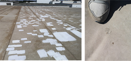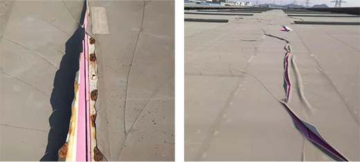 该项目,使用带纤维背衬的聚氯乙烯防水卷材。由于没有内增强织物的存在,无法有效的将机械固定件的点荷载分散成面荷载。当遇到强风时,尤其是在冬季寒冷天气,卷材较之高温天气变的硬脆后,直接造成卷材撕裂破坏。类似的情况也会出现在把均质型产品用于大面机械固定。这也体现了有无增强织物,以及增强织物采用无纺布还是编制织物的作用机理差异。
