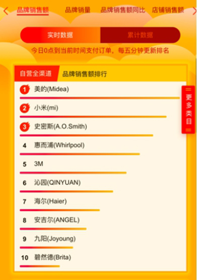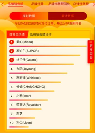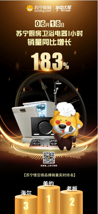 苏宁618当日,截至1点,厨房卫浴电器销售量同比183%,其中烟灶套餐同比增长119%,零冷水热水器是同期的6倍,垃圾处理器同比增长1433%。至00:03净水器销量突破2万台;截至1点净水器销量同比增长238.20%,洗碗机同比增长225.25%。