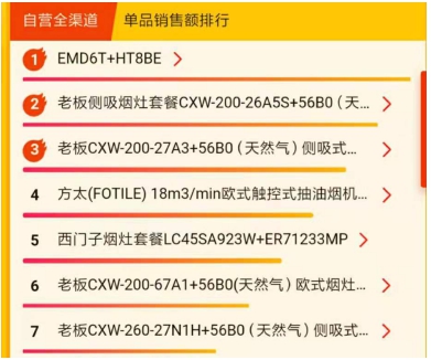 *后来看下烟灶套餐悟空榜,零点还在*位上的百德落后至第十位,华帝,老板方太三大品牌紧随其后。虽然苏泊尔、澳柯玛等略微靠后。但在单品销售额上,“老板、方太”两大品牌销售数据喜人。