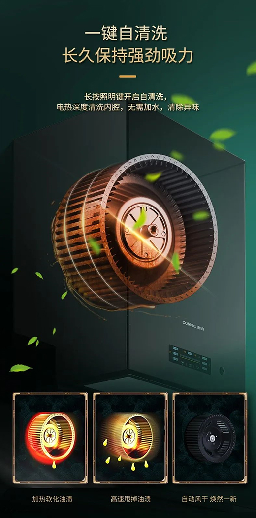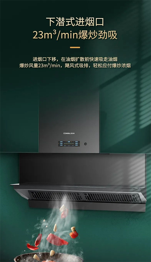 康纳K3S采用潜吸式跨界设计,低位拦截油烟。相比原有的K3,创新升级了风道系统,从原来的20m³/min升级到23m³/min。同时搭载450Pa强排大风压,无论楼层多高,都能畅通无阻,给予用户自由的烹饪体验。