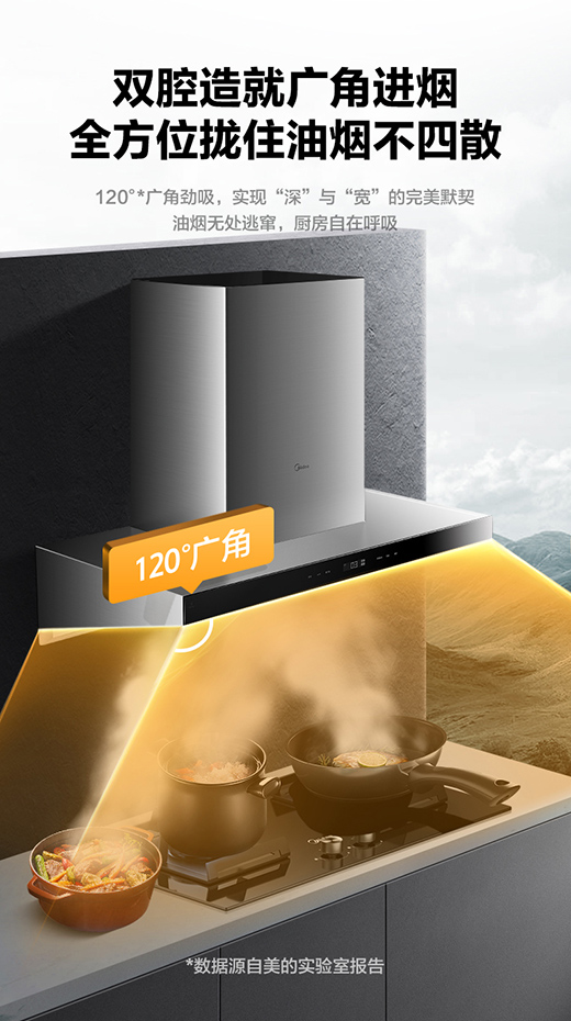 生活中我们经常碰见烹饪时,明明开了油烟机,但却无法将爆炒油烟吸净的时刻,常常是呛得无法呼吸,究其原因,主要是因为家里烟机烟腔太浅,无法吸拢所有油烟。美的新中式顶吸烟机E90飞阁针对这一痛点,在设计时让烟腔主动下潜125mm,烟腔容积是传统欧式烟机的1.7倍,即使长时间爆炒也不跑一丝烟,因为它的设计更接近烹饪黄金吸烟区域,聚吸效率比传统塔式烟机提高了65%,排烟效果更顺畅,比较适合有爆炒饮食习惯的家庭。它还将中国传统建筑飞阁的造型融入其设计中,宽广的“飞阁”拥有120°的广角,实现了“深”与“宽”的完美契合,放置三口锅劲洗效果更明显,让油烟无处逃窜,另用户在厨房享受大自然般清新体验。