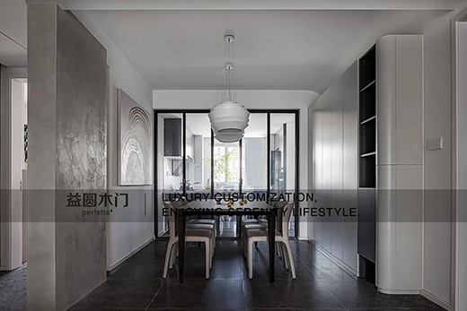 将公共空间的收纳更多集中在餐厅的一侧,保持恰当的体量,兼具遮物和陈列两种功能,柜门留白最大限度让表明平整无饰,让空间在视觉上更充裕。