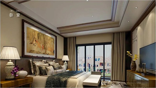 中欧混搭格调的卧房,采用了中式古风壁画搭配西式家具台灯,营造出卧房恰到好处的中式韵味,又不失现代感。吊顶无主灯设计,换成错落分布的小筒灯,宛如繁星。