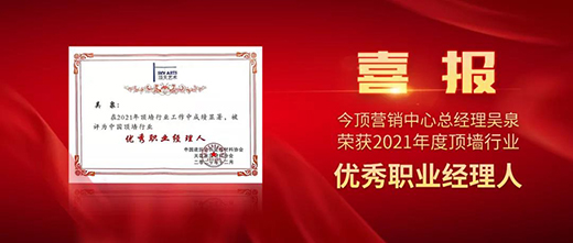 这些荣誉同样离不开做出贡献的团队和个人,在2021年中国顶墙行业年会上,今顶董事长周建成荣获“2021年度中国顶墙行业风云人物”;今顶副总经理华伟荣获“2021年度顶墙行业先进工作者”;今顶全国营销总监吴泉荣获“2021年度顶墙行业优秀职业经理人”;今顶(运城)门店荣获“2021年度顶墙行业五星级示范店”;今顶(石家庄)门店穆亚鹏荣获“2021年度顶墙行业优秀经销商”。