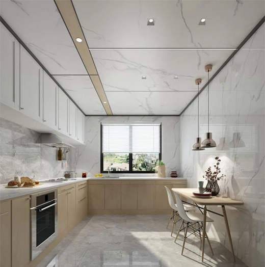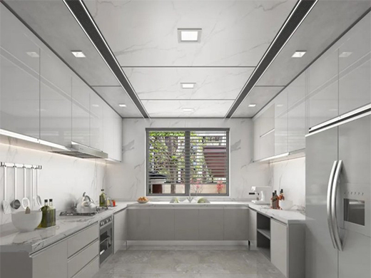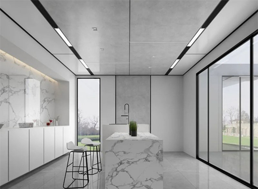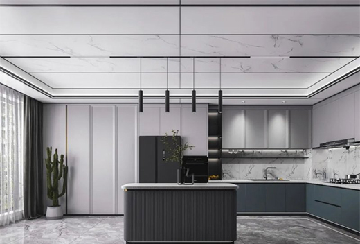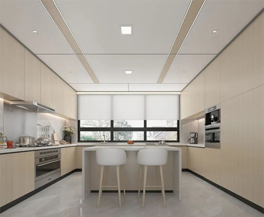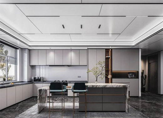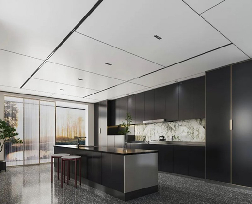 关于厨房吊顶的装修,更多的是对设计的把握和对空间的理解与布局,欧美蜂窝大板通过与型材线梁的完美组合为消费者带来不一样的视觉空间体验,它可以按照我们的空间需求任意裁切、组合,其产生的拼接和缝隙远远少于传统吊顶,降低了板材的损耗,更加契合全屋整装的需求,使现代空间装饰呈现更加整体的效果,完美适配各种家装风格。