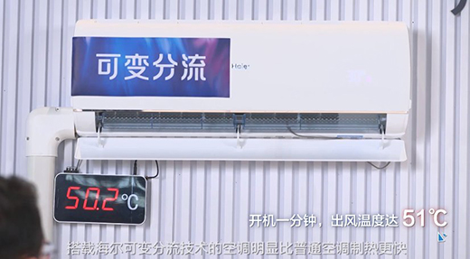那么海尔“潮汐空调”的表现如何?两台空调同时开机,一分钟后,海尔“潮汐空调”出风温度达到51℃,而普通空调只有47℃。“这边的温度变化特别快”,通过不断对比发现,在低温环境下,海尔“潮汐空调”依然具备更快的制热速度、更好的制热效果,“这个温度吹出来的风制热效果肯定非常好,屋里边很快就能暖和起来!”