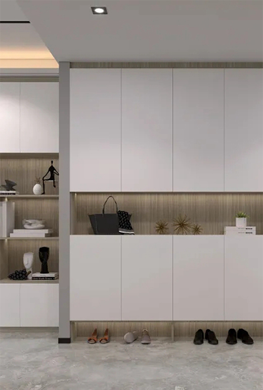 趟门衣柜依墙而立,柔软低调的灰色墙面契合木色的温润,奔波在外的身心在此刻得以放松。