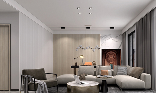 不同明暗度的色彩,增添客厅空间的视觉层次,原木与大理石的结合,精致简洁且和谐统一。