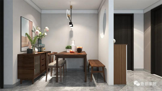 木纹质感的餐边柜可以尽情收纳,增加抽屉设计可以方便物品的日常取放,百叶造型的柜门与空间整体格调和谐一致,不同造型的餐椅与吊灯形成一种和谐美,加上光的穿透力,让这小小的空间也变得典雅时尚。