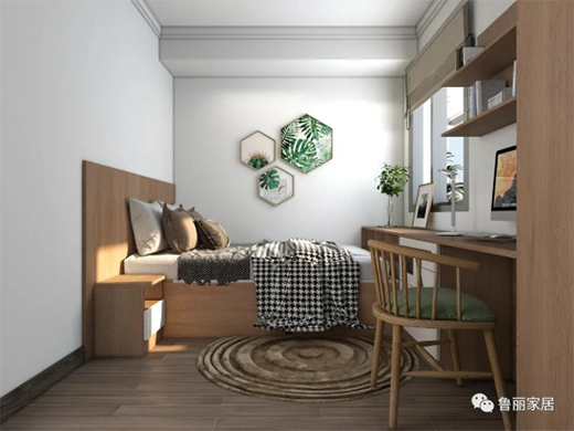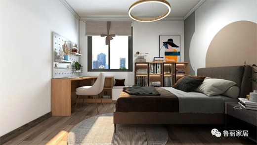 卧室虽小,但鲁丽家居的定制设计还是将空间的利用做到了最大化。转角书桌充分利用拐角区域,与书柜相结合在卧室中打造出一片学习的小天地。