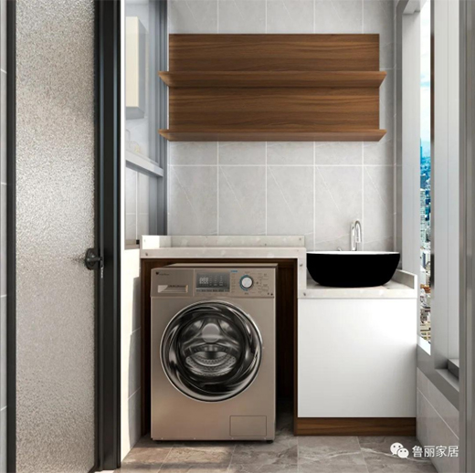 阳台的有效利用可以为家庭解决许多烦恼。洗手台下做收纳柜,既可以将排水管隐藏,又可以收纳日常杂物。洗衣机嵌入台面,有效利用上方空间设置置物台,将空间完美划分。在这里摆上你喜欢的花草,也是你休闲放松的好去处。