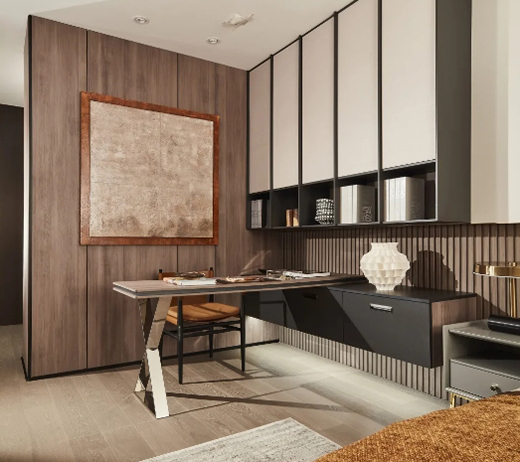 兼具收纳、装饰功能的书柜,利用开放格与封闭柜组合,增强了书房的层次感,为读书时营造出静谧的氛围,造型简约的书桌与收纳柜连接成一体,表现出空间独特的美感,可谓匠心独运。简约的复古地毯与书桌后的木纹背板相互呼应,把古典和雅致融合统一。
