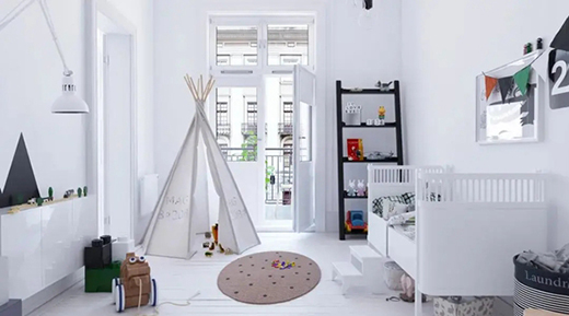 儿童房的墙面配色建议优先选择亮丽、轻松、柔和的色调,用白色作为过渡色,以便于对房间内不同的功能区域进行划分。所以在配色上我们可以根据不同年龄阶段来选择相应的色彩,让孩子的童年更加五彩缤纷。