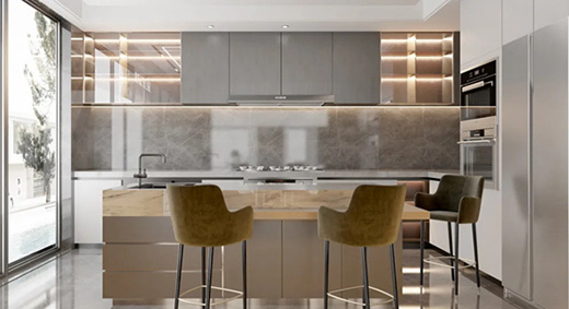 高级灰拥有优雅的色彩,一直以来都是时尚的象征,低调的质感彰显着极致的魅力。当低调不张扬的高级灰与厨房空间结合,搭配金属配件,碰撞出优雅轻奢的火花。